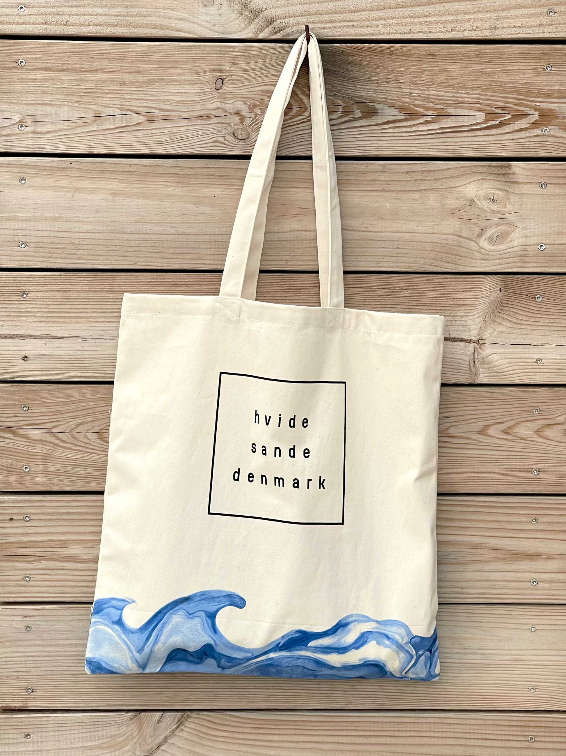 Our custom-made signature tote bag with ocean-inspired wave design.